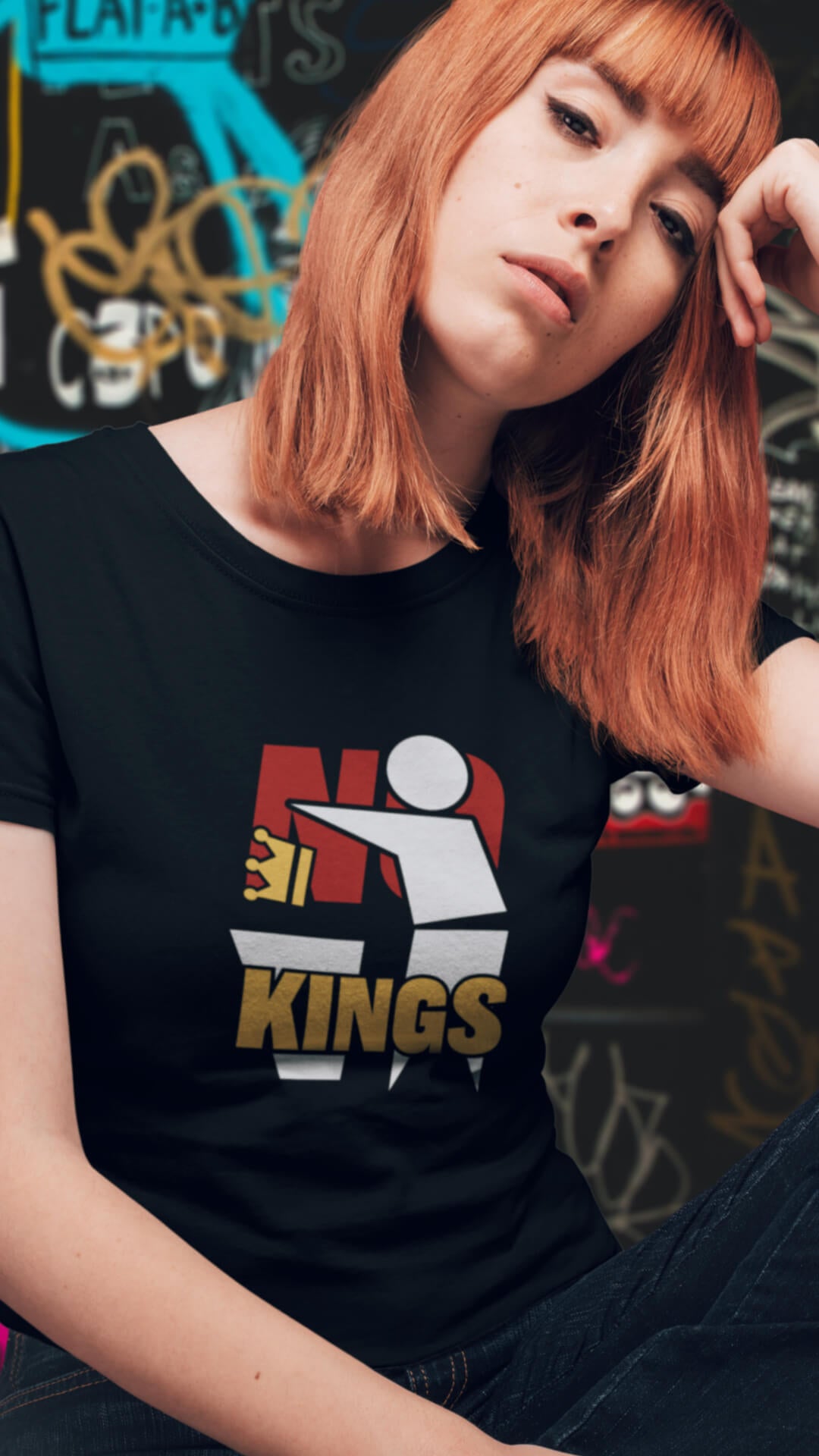 T-shirt supporting the No Kings initiative. All proceeds from sales go directly to support Ukraine, which has been resisting Russian occupation for three years now.The world today is full of self-proclaimed kings, tyrants, tsars, and emperors. If we allow them to seize power, we risk losing everything. Design by Jednotka chaosu.
