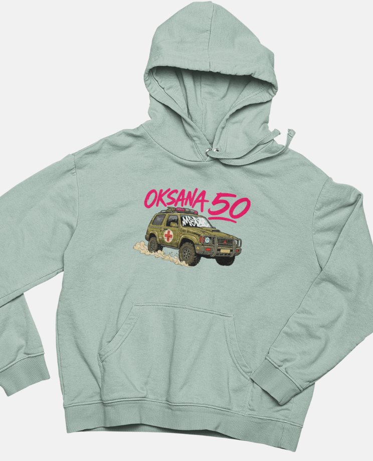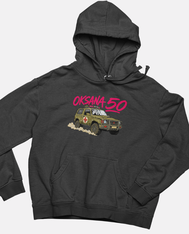 A hoodie for the Czechoslovak campaign to purchase fifty cars for Ukraine, featuring an illustration by Dodo Dobrík.
