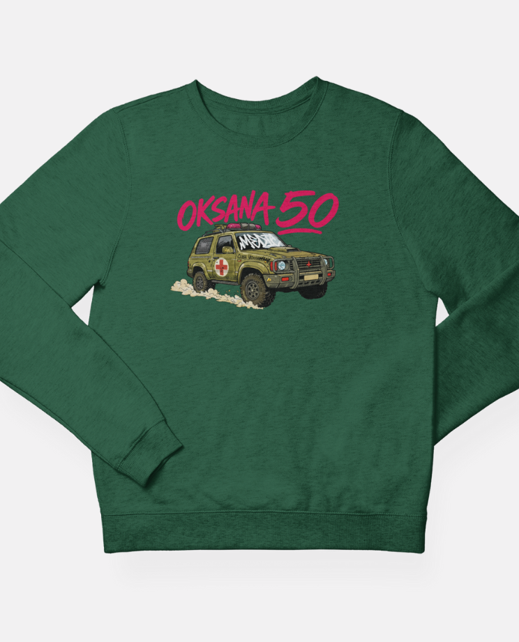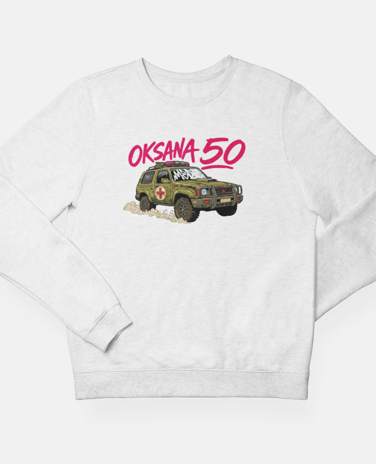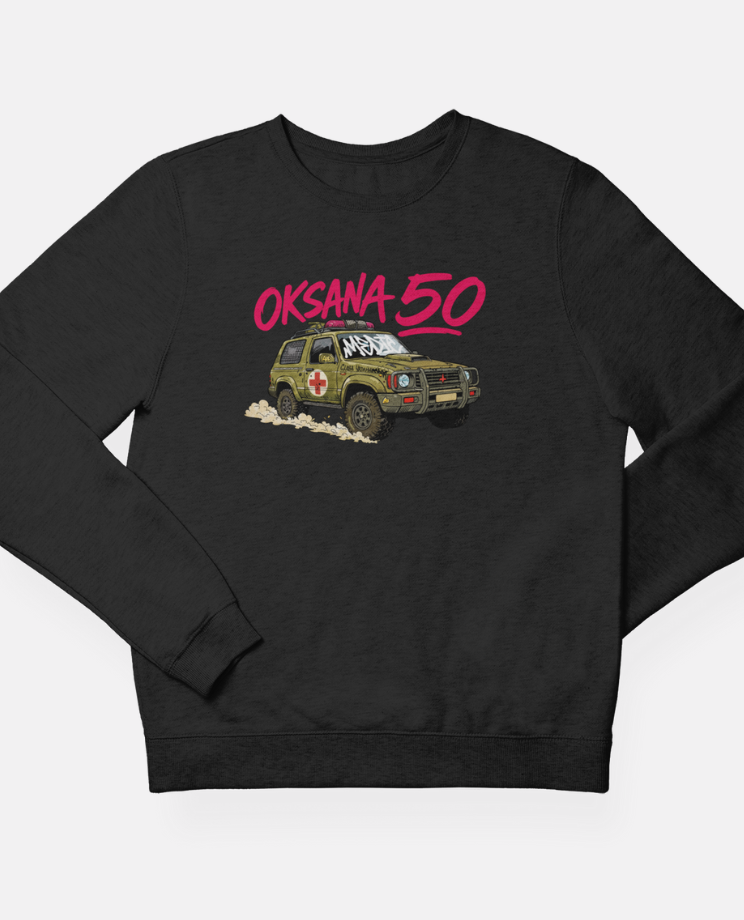 A sweatshirt for the Czechoslovak campaign to purchase fifty cars for Ukraine, featuring an illustration by Dodo Dobrík.