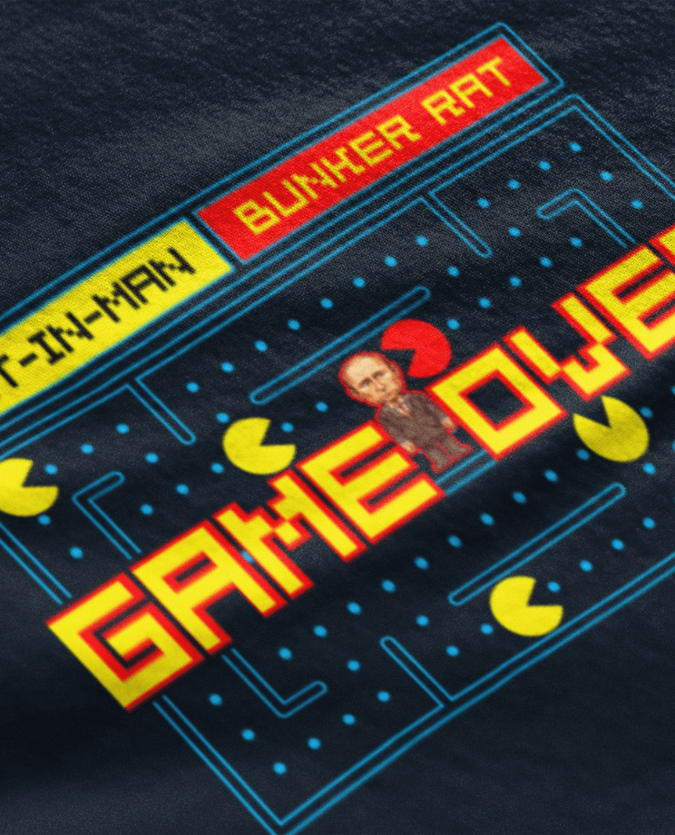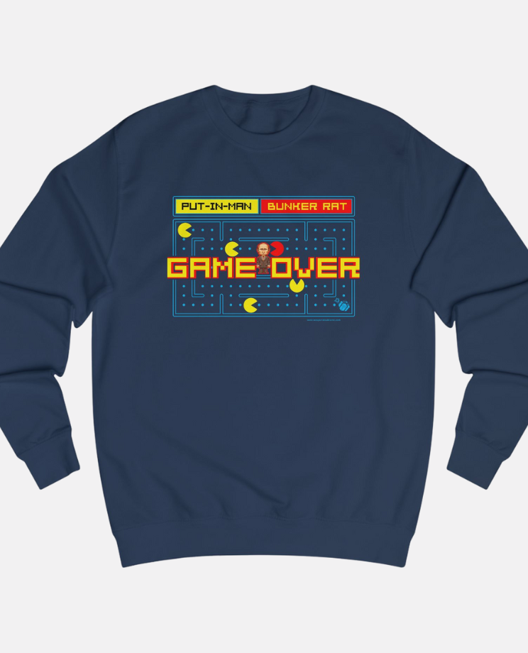 Dark blue, warm, long-sleeved sweatshirt featuring a Pac-Man-inspired design by Slovak artist Dodo Dobrík.
