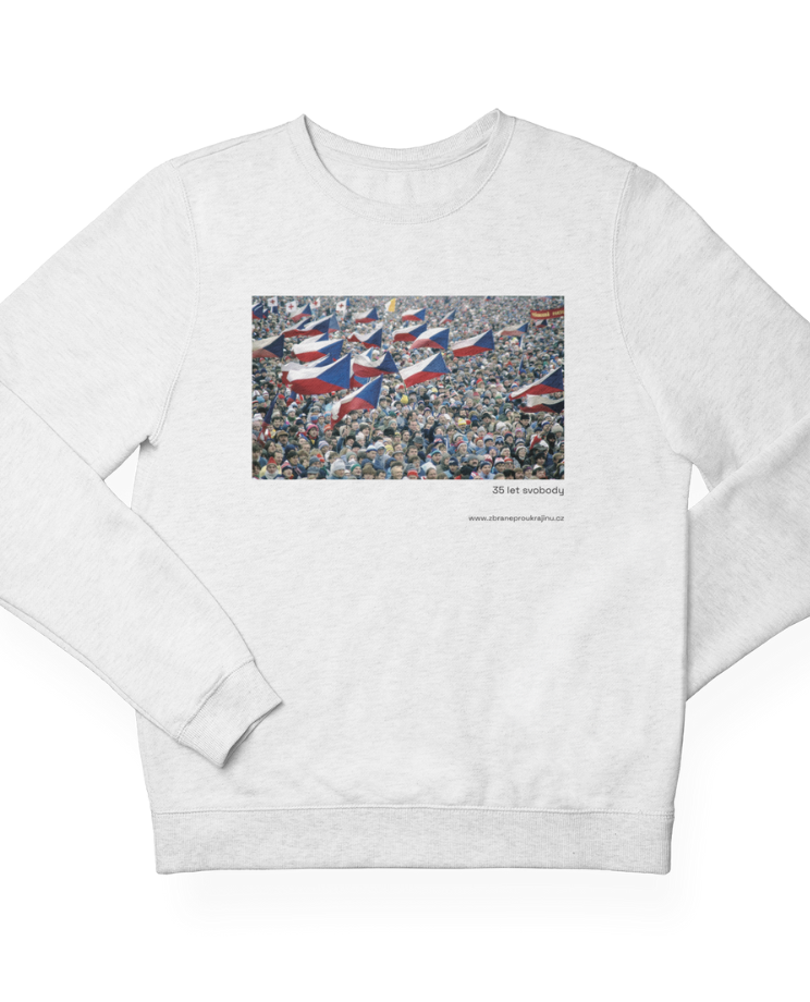 Bílá hřejivá mikina s dlouhým rukávem s fotografií z listopadu 1989. Autorem fotografie je Justin Leighton, o grafickou úpravu se postaral slovenský grafik Dodo Dobrík.