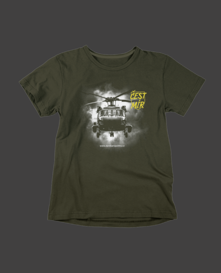 Kvalitní tričko ve vojenské zelené s grafikou kampaně na nákup helikoptéry Čestmír pro ukrajinskou armádu. Nákupem trička podpoříte další fungování projektu Dárek pro Putina. Autorem grafiky je Dodo Dobrík.