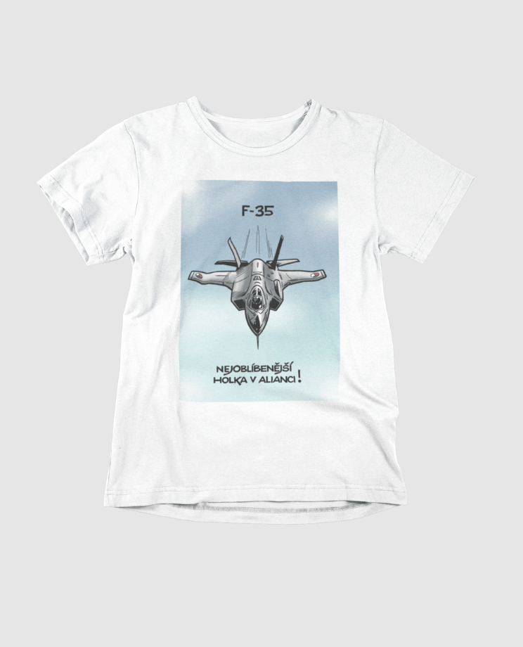 Bílé unisex tričko s motivem stíhačky F-35, která vzniklo pro ministryni obrany ČR Janu Černochovou. O ilustraci se postaral český výtvarník Štěpán Mareš