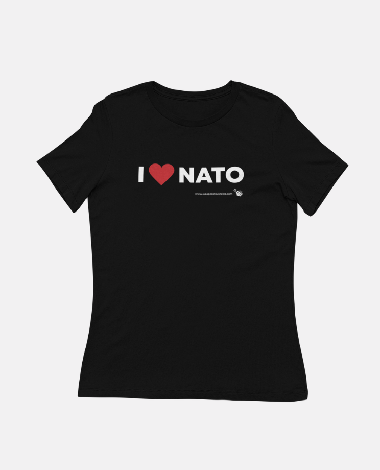 Černé bavlněné dámské tričko s nápisem, který oslavuje fakt, že ČR je konečně součástí nějakého vojenského paktu, který nenapadá vlastní členy. Autorem grafiky je Dodo Dobrík.
