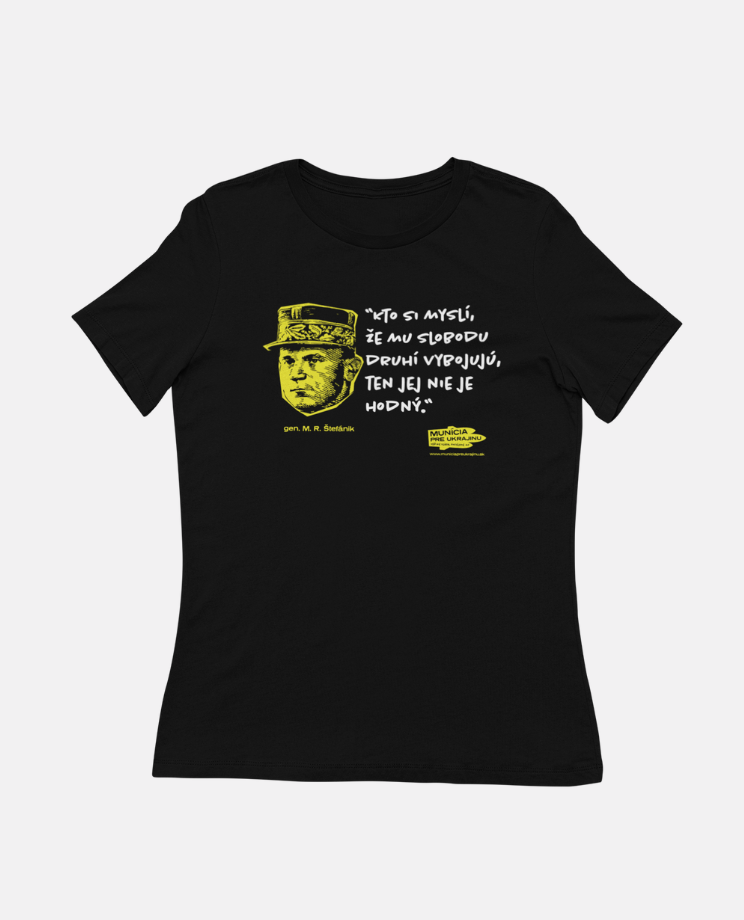 Kvalitní dámské černé tričko s podobiznou Milana Rastislava Štefánika, slovenského politika a československého ministra vojenství. Autorem grafiky je slovenský designér Dodo Dobrík.