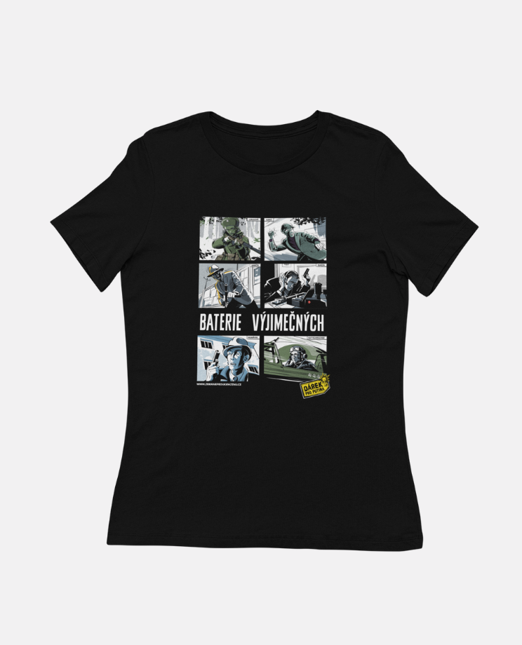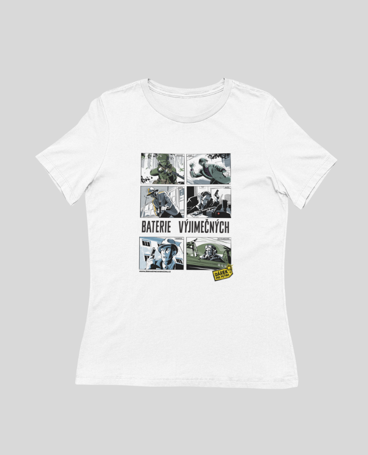 Bílé nebo černé dámské tričko s motivem šesti superhrdinů československé historie z kampaně Baterie výjimečných. Autorem ilustrací je český výtvarník Lukáš Fibrich, o grafickou úpravu se postaral slovenský grafik Dodo Dobrík.