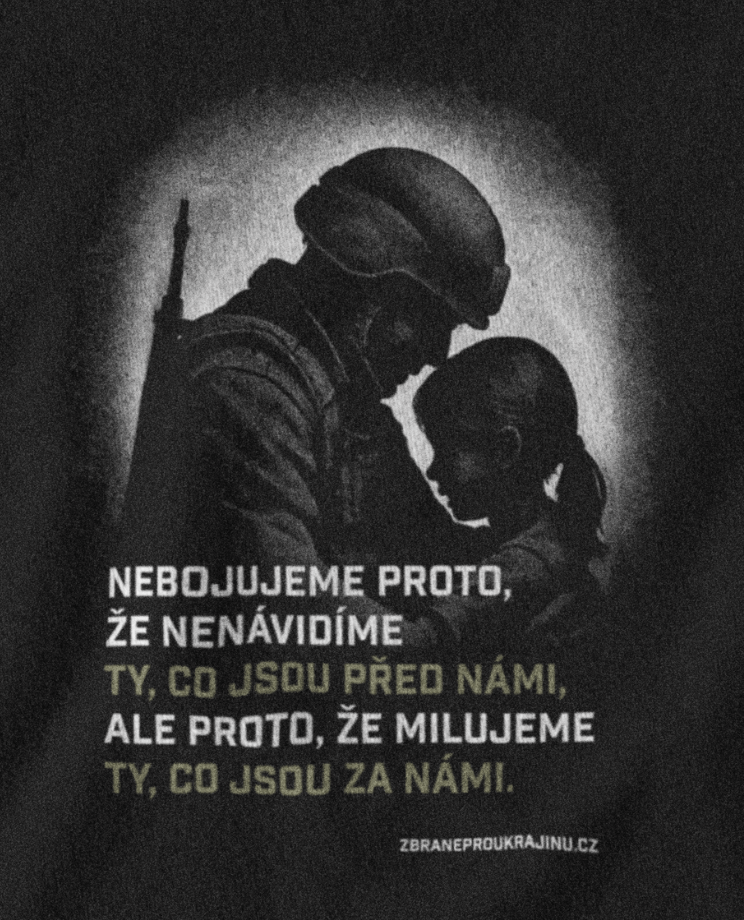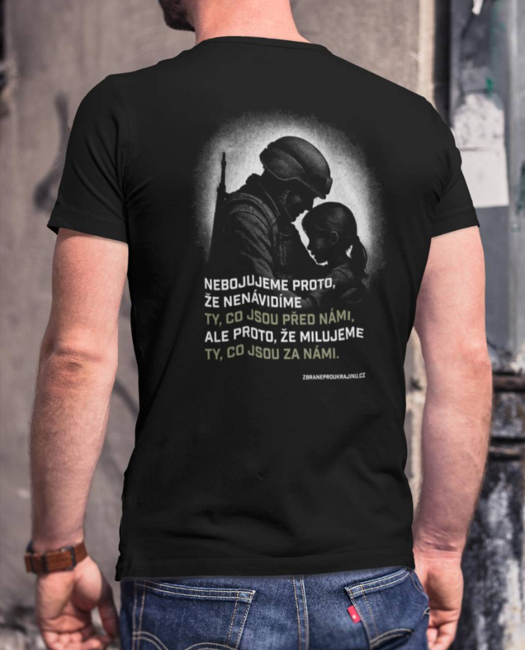 Tričko ke dni otců, kteří brání svoji zemi s parafrází citátu spisovatele Gilberta K. Chestertona: "Nebojujeme proto, že nenávidíme ty, co jsou před námi, ale proto, že milujeme ty, co jsou za námi." Oboustranný potisk. Grafika: Dodo Dobrík.
