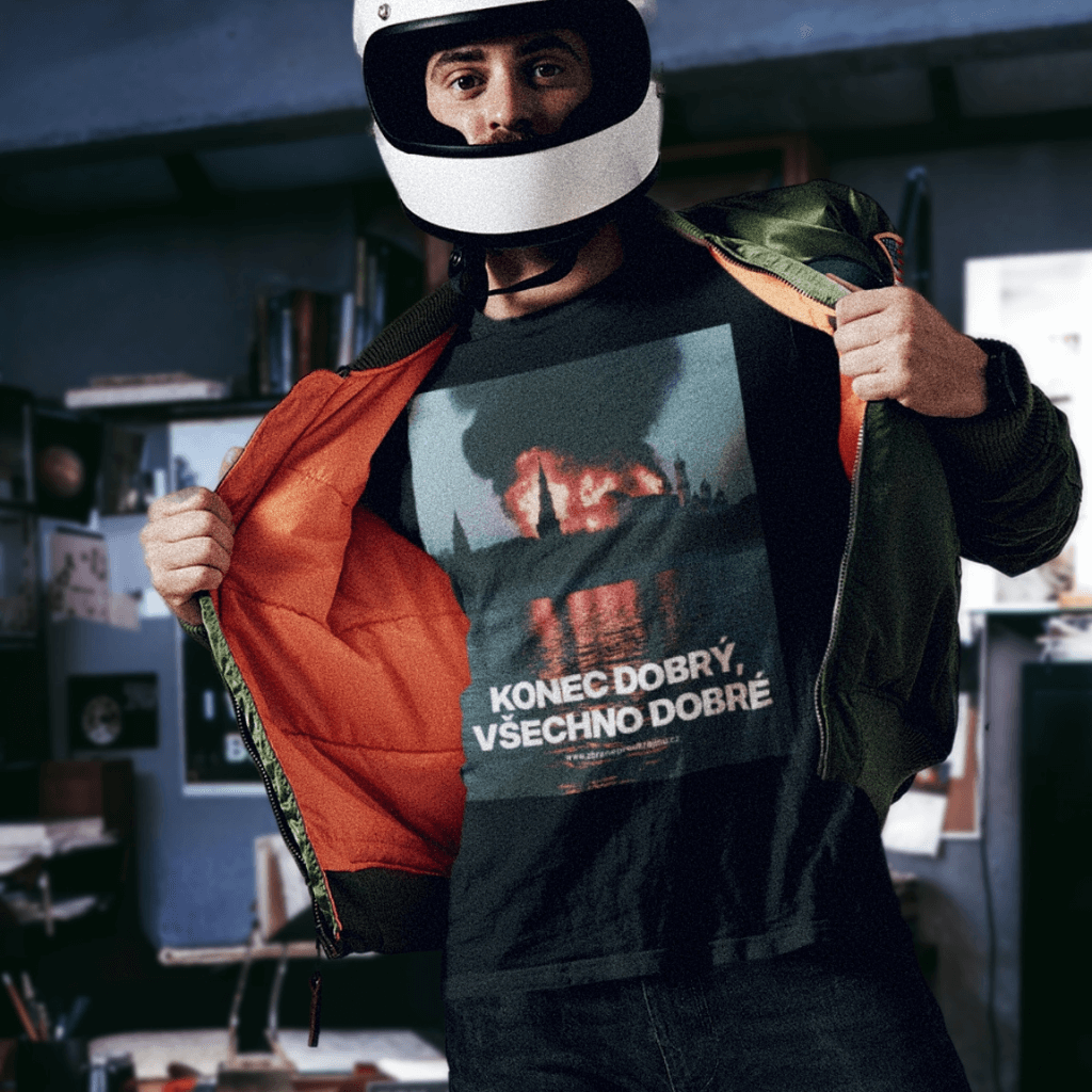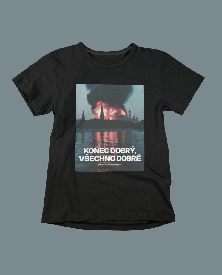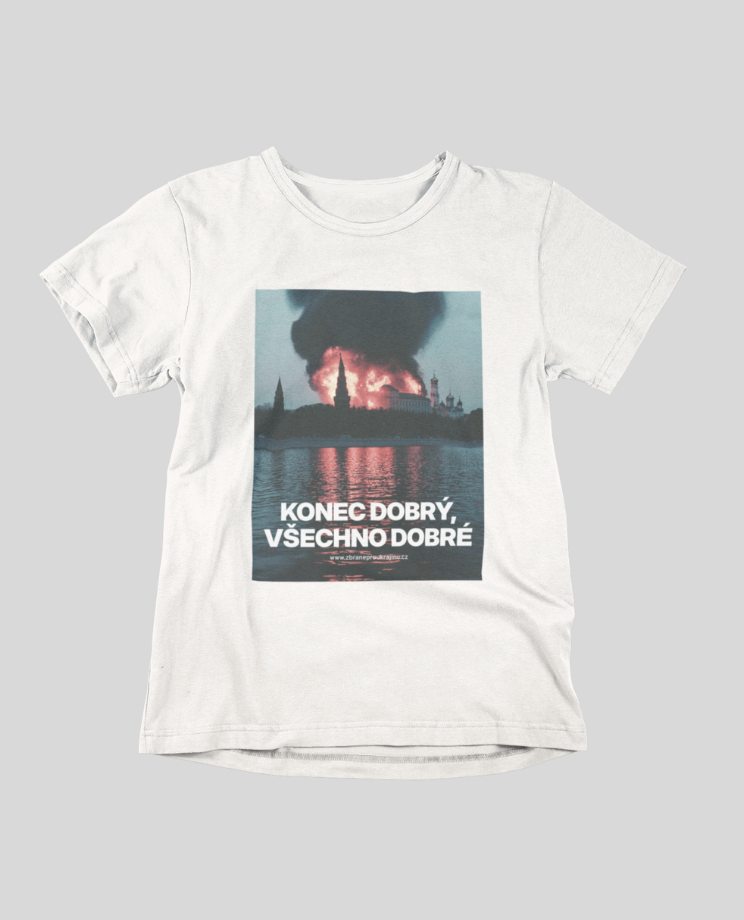 Dokud to dobře nedopadne, tak není konec. Tričko s nejkrásnějším výhledem na moskevský Kreml v tom stavu, jaký bychom si všichni přáli. Autorem grafiky je Jednotka chaosu.
