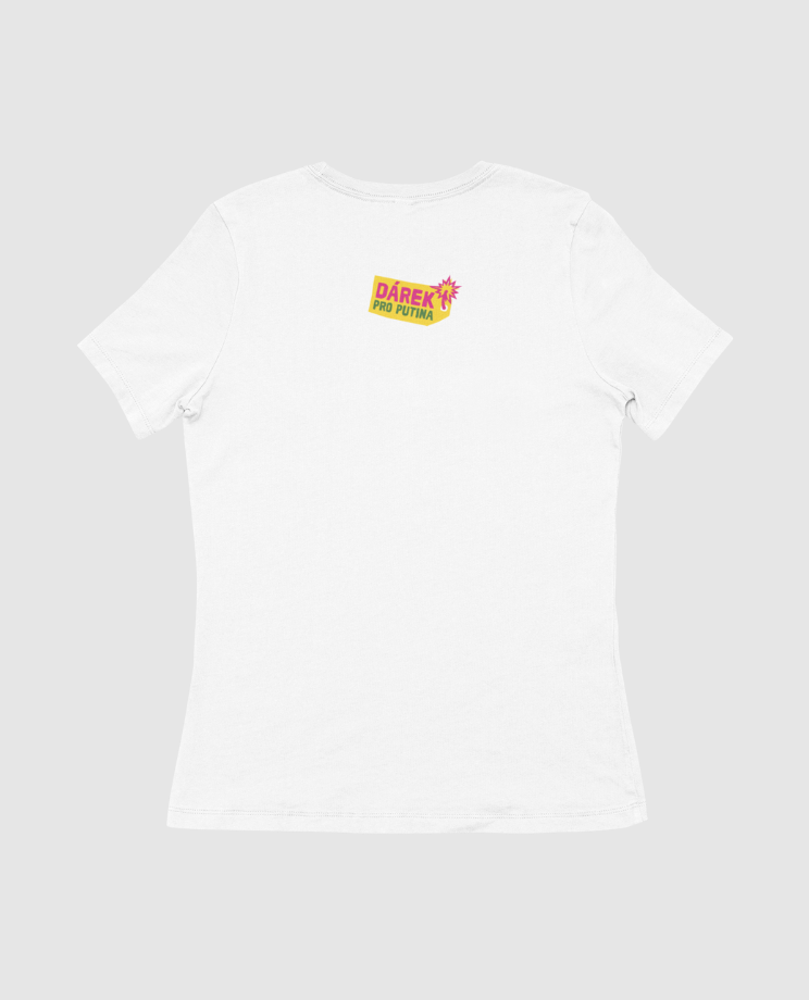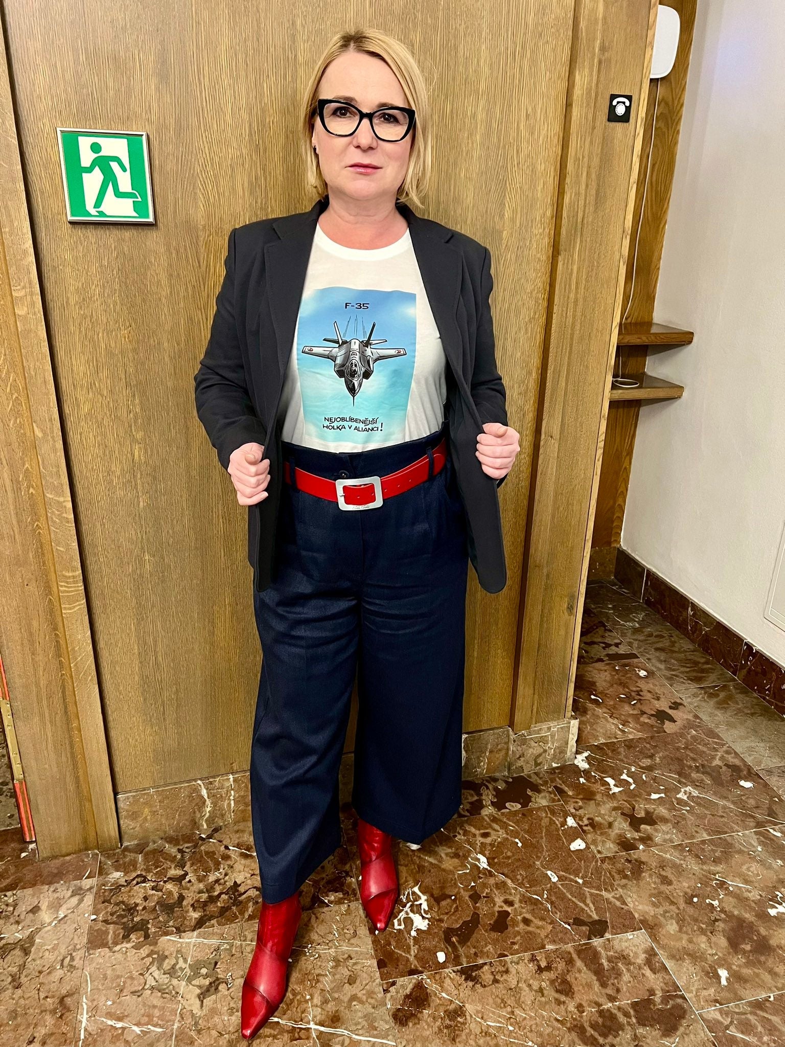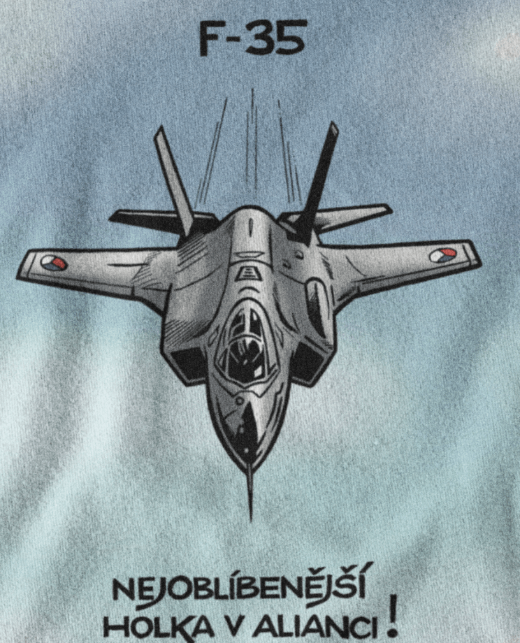 Biele dámske tričko s motívom stíhačky F-35, vytvorené pre českú ministerku obrany Janu Černochovú. Ilustráciu vytvoril český výtvarník Štěpán Mareš.