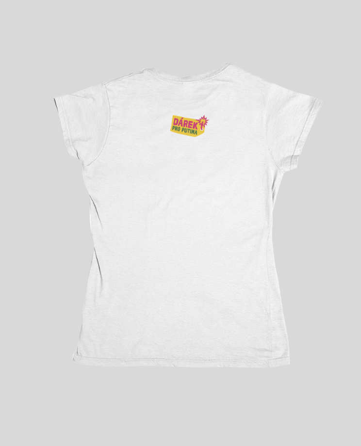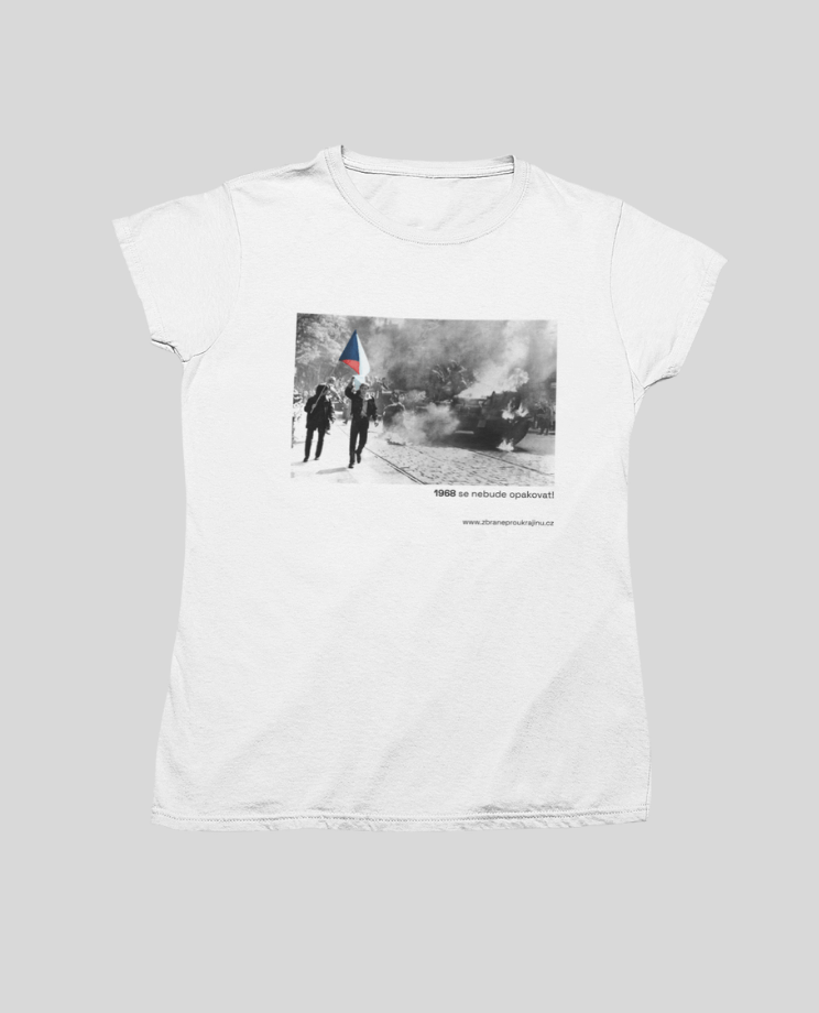 Bílé dámské tričko k letošnímu 55. výročí okupace Československa vojsky Varšavské smlouvy s fotkou, kterou během srpnových události v roce 1968 pořídil neznámý analytik CIA. O 55 let později pomáháme Ukrajině, aby se rok 1968 už nikdy nemusel opakovat.